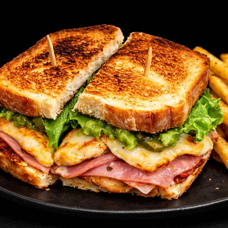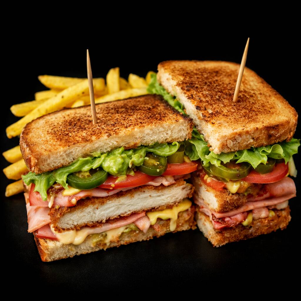 Sándwich de pollo a la plancha, con doble tocino, doble queso, jamón, guacamole, jalapeños y lechuga.