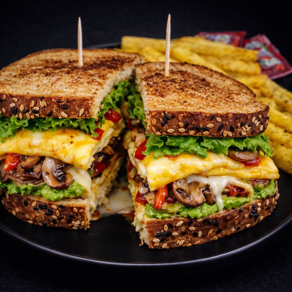 Sándwich de huevo, con champiñones sazonados a la plancha, pimiento morrón y cebolla asados, guacamole y lechuga.