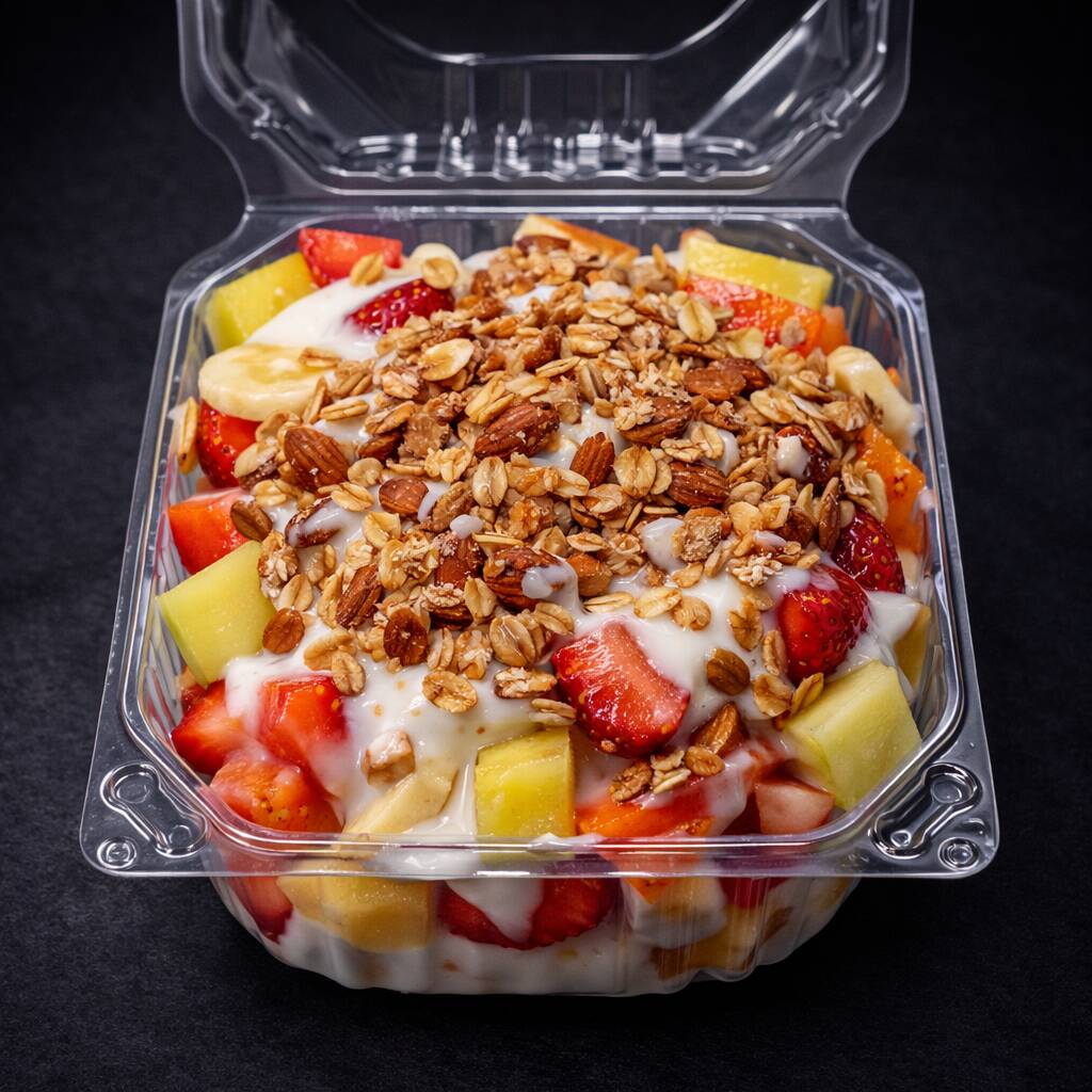 Trocitos de fruta fresca de tu elección, agrega toppings si lo deseas.