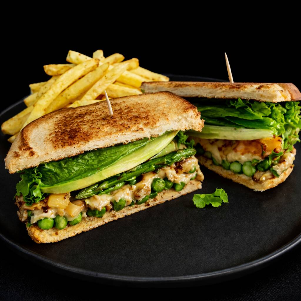 Sándwich de esparragos asados, con piña asada, queso, aderezo mil islas, lechuga e incluye un side para acompañar.