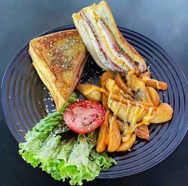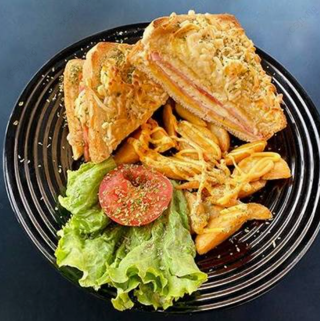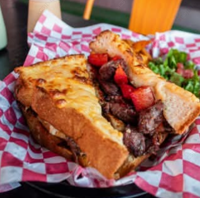 Deliciosa nueva especialidad de la casa, sándwich relleno de jamón york, queso asadero, arrachera y salchicha roja, gratino en 3 quesos, incluye papas gajo y ensalada fresca.
