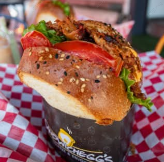 Tocino, huevo, queso amarillo, lechuga, aderezo de frijol-chipotle y perejil seco.