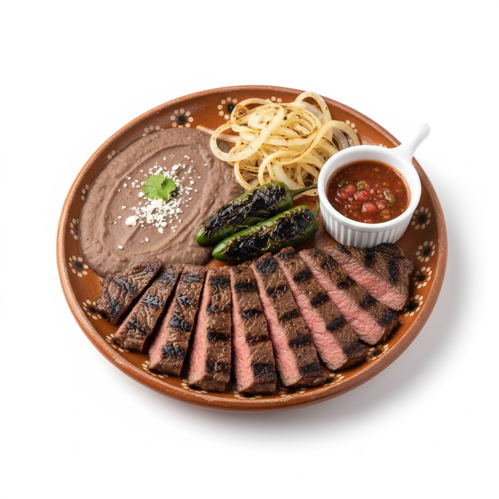 "Nuestra joya de la corona: una jugosa arrachera de primera, asada con devoción para alcanzar la textura perfecta. servida con la bendición de unos frijoles refritos caseros, cebollitas asadas que son una gloria y el toque picante de nuestros chiles toreados.