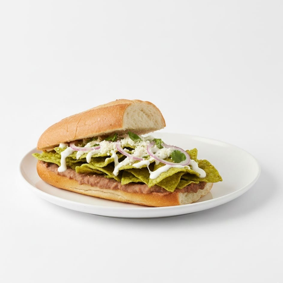 Nuestro bolillo untado con frijoles caseros y coronado con queso fresco bendecido. En su corazón, crujientes totopos bañados en la salsa de tu elección y tu proteína favorita. ¡La Chilatorta es la respuesta a tus antojos más divinos!"
