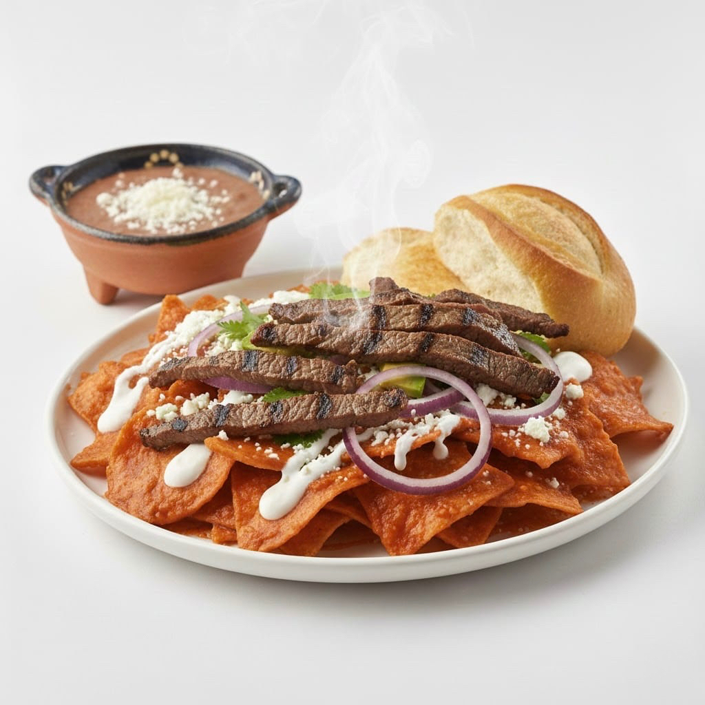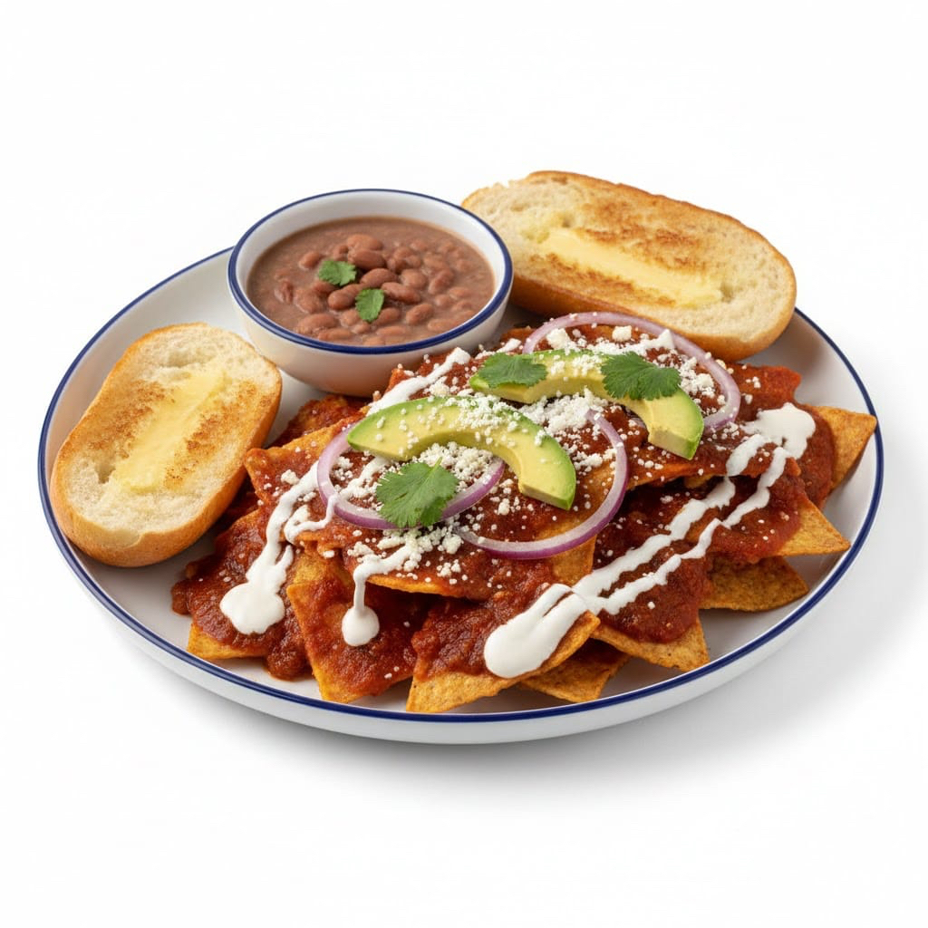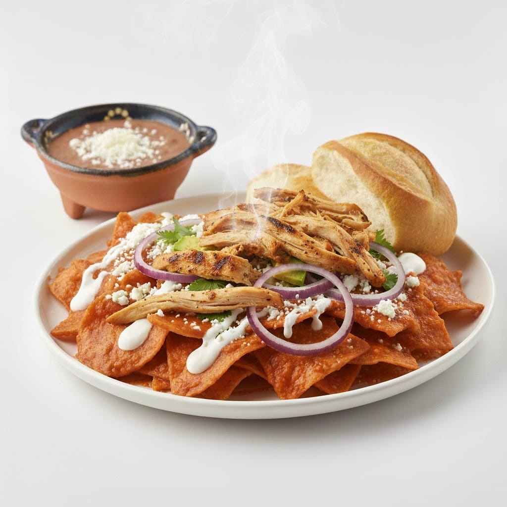 Nuestros crujientes totopos, bañados con la salsa de tu elección, se coronan con una jugosa milanesa de pollo asada. completamos con frijoles refritos caseros, cebolla morada fresca, láminas de aguacate celestial, un toque de cilantro, crema y queso fresco.