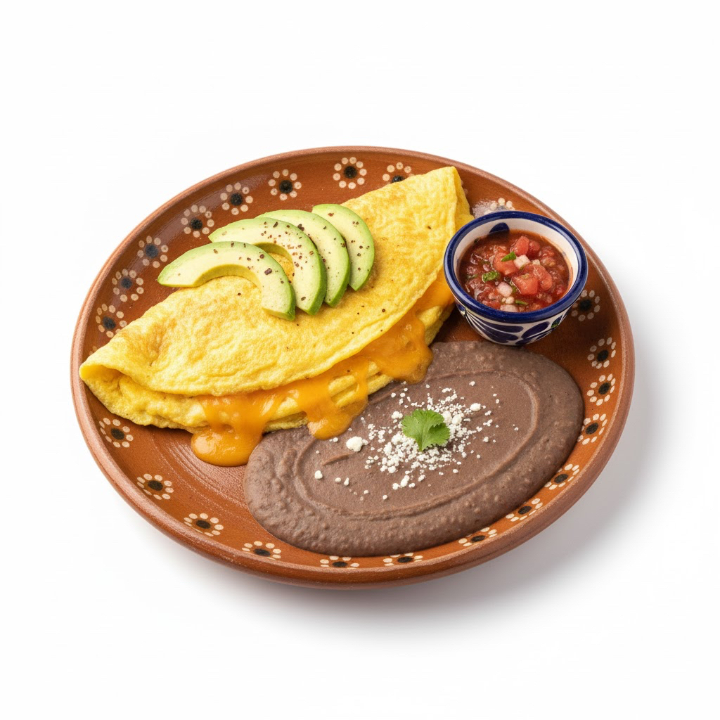 "Omelette clásico relleno de queso manchego, acompañado de rebanadas de aguacate y frijoles refritos caseros. una opción ligera y sagrada para despertar tus sentidos."