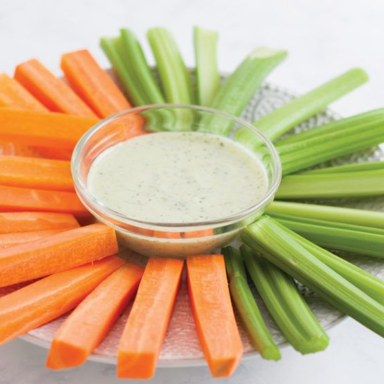 Bastones de apio y zanahoria acompañados con aderezo Ranch.