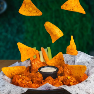 Trocitos de pollo empanizado bañados en salsa buffalo y con un toque deDoritos Nacho espolvoreado. acompañados de apio y zanahoria con aderezo ranch
