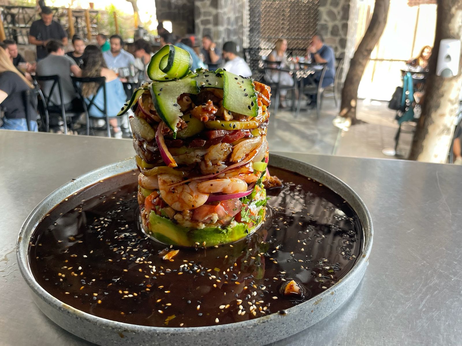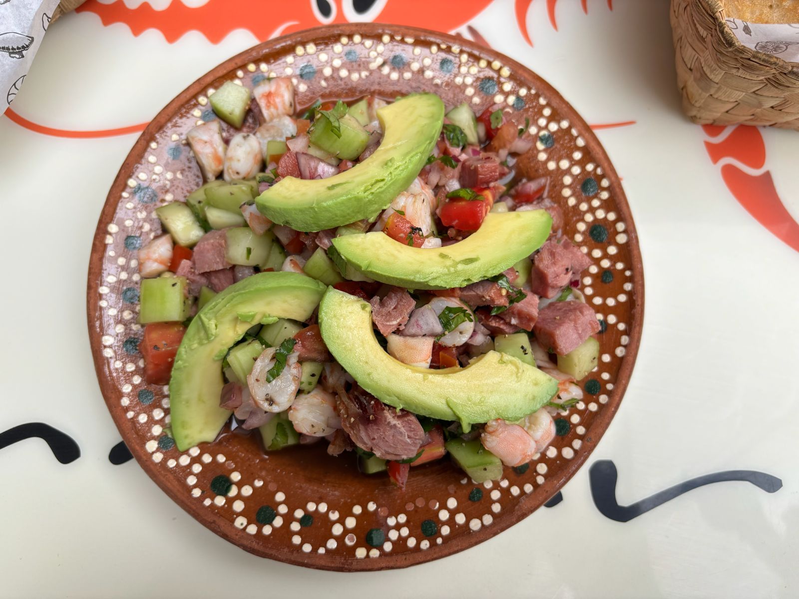 Atún, marlin, pulpo y camaron preparados con jitomate, cebolla, cilantro, pepino, limon y aguacate