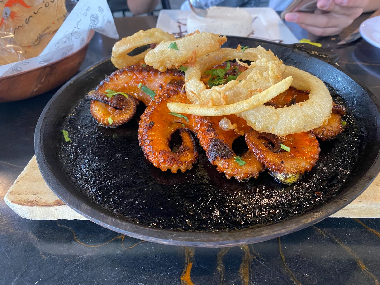 pulpo adobado previamente en una salsa de la casa y zarandeados a la plancha