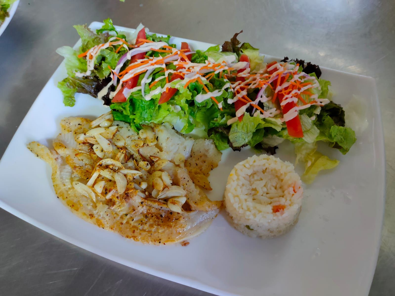 Filete a la plancha, acompañado de ensalada y arroz blanco
