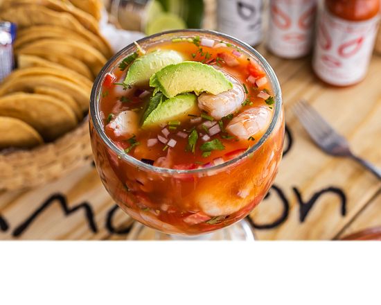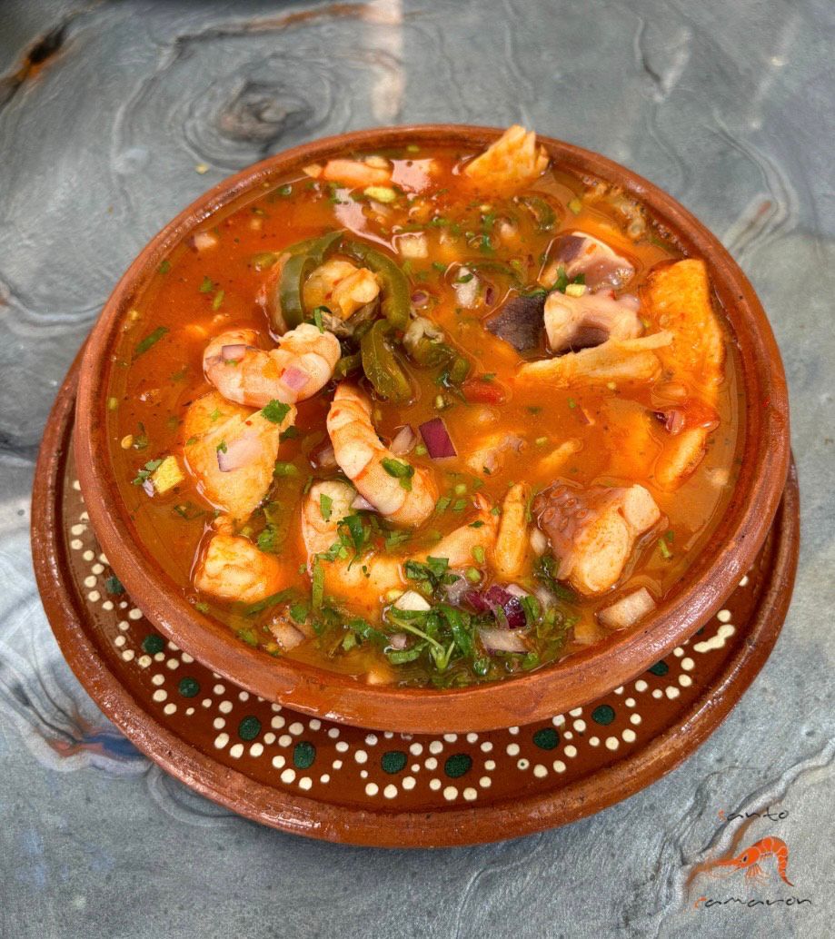 Preparado con pulpo, ostion y camarones en frio con salsa bruja, salsa inlgesa, limon, jitomate, cebolla, cilantro, salsa de la casa, salsa catsup y laminas de aguacate