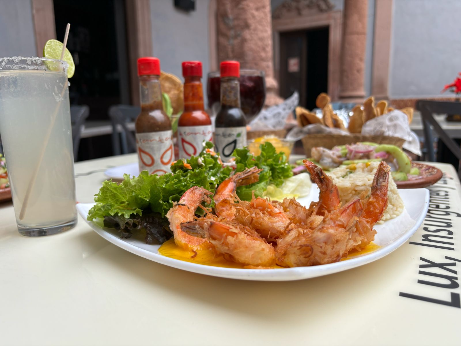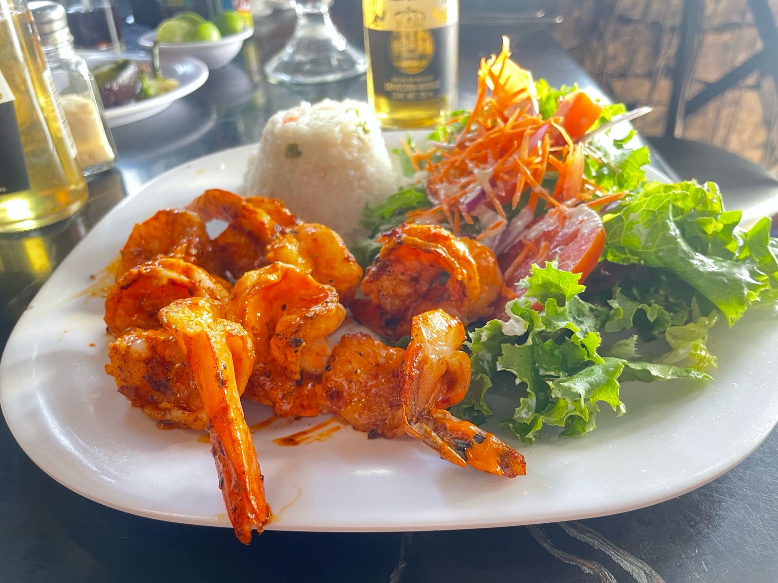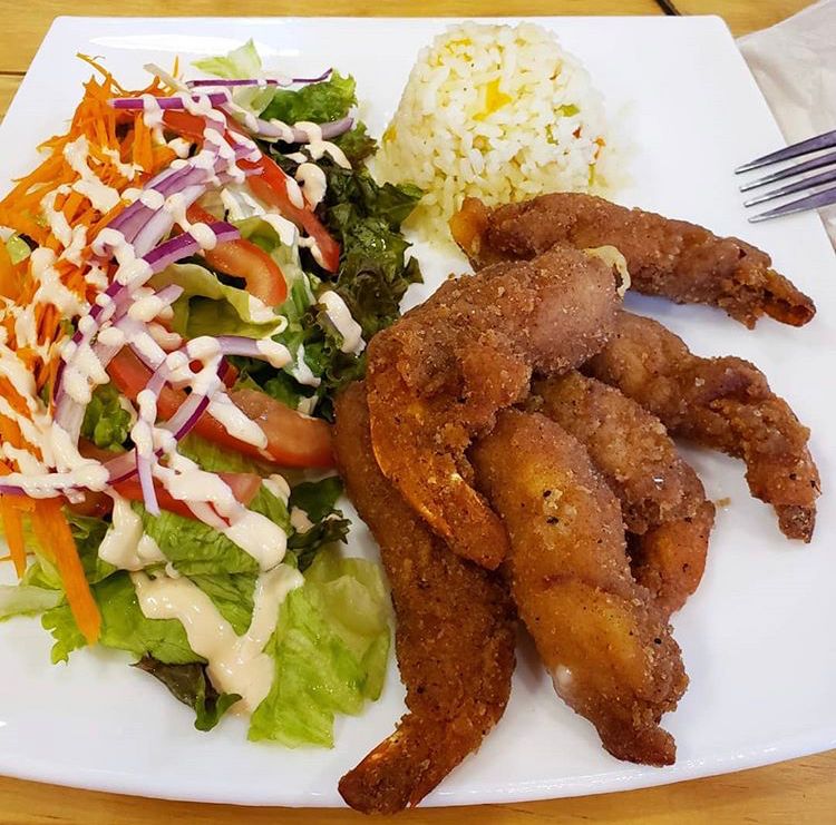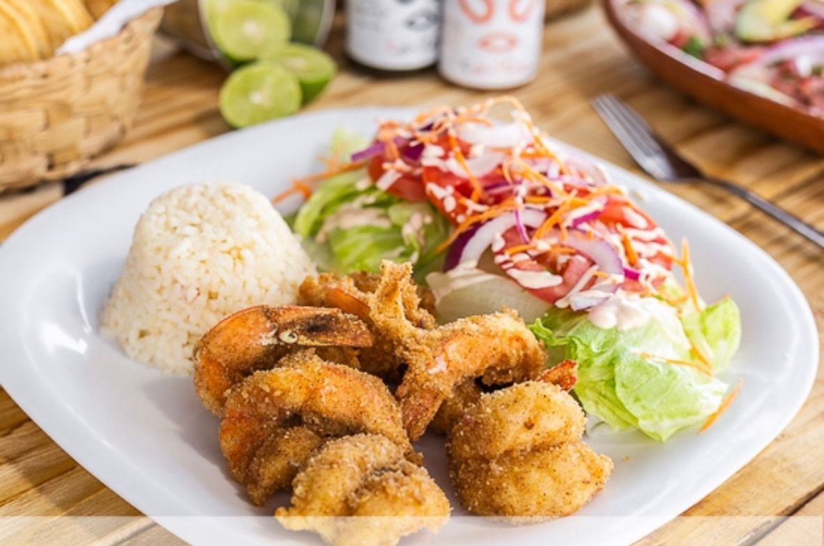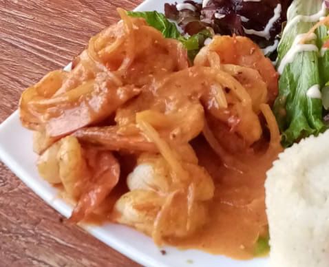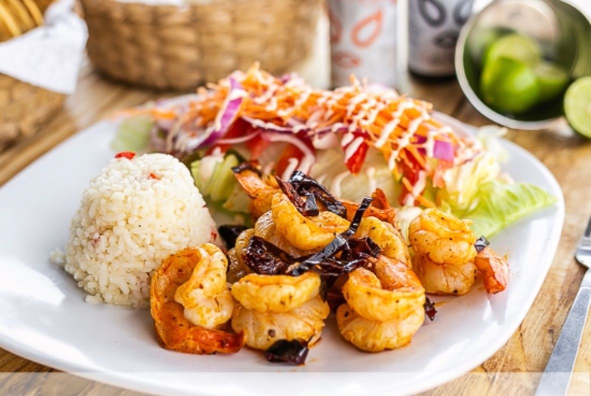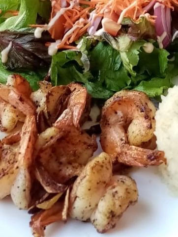 Camarones y hojuelas de ajo, acompañado de ensalada y arroz blanco