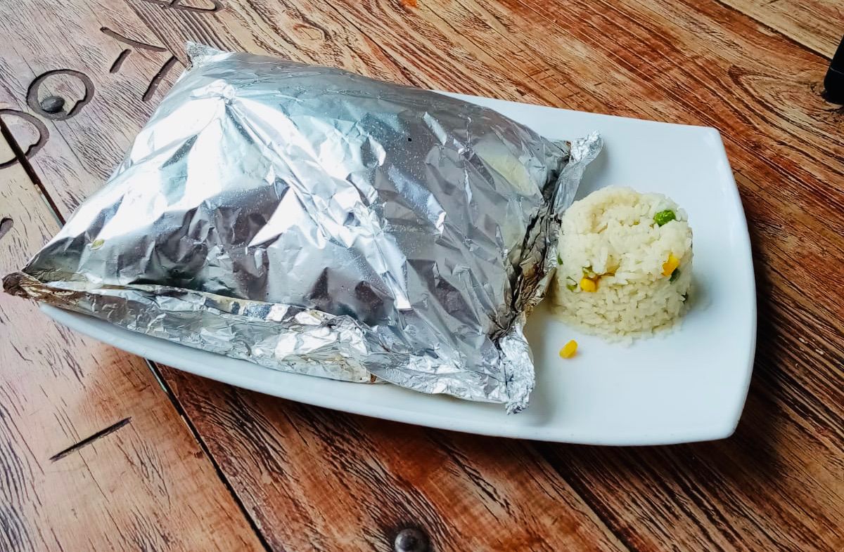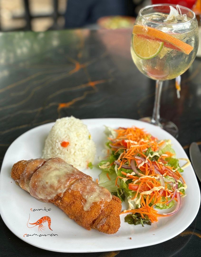 Filete empanizado con pan de la casa, relleno de camaron, pulpo y tocino, y el toque final gratinado. Acompañado de ensalada y arroz