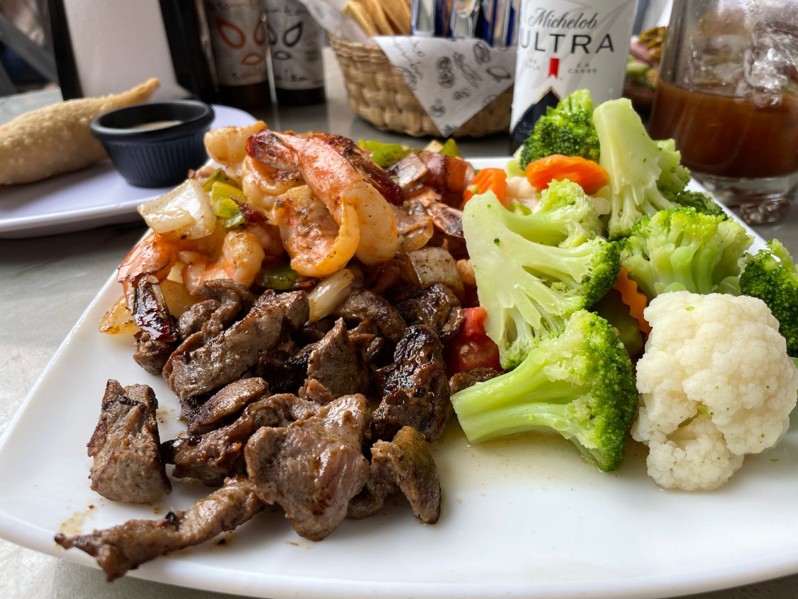 Arrachera y camaron preparado con tocino, cebolla y pimiento morron, acompañado de zanahoria, chicharos y granos de elote