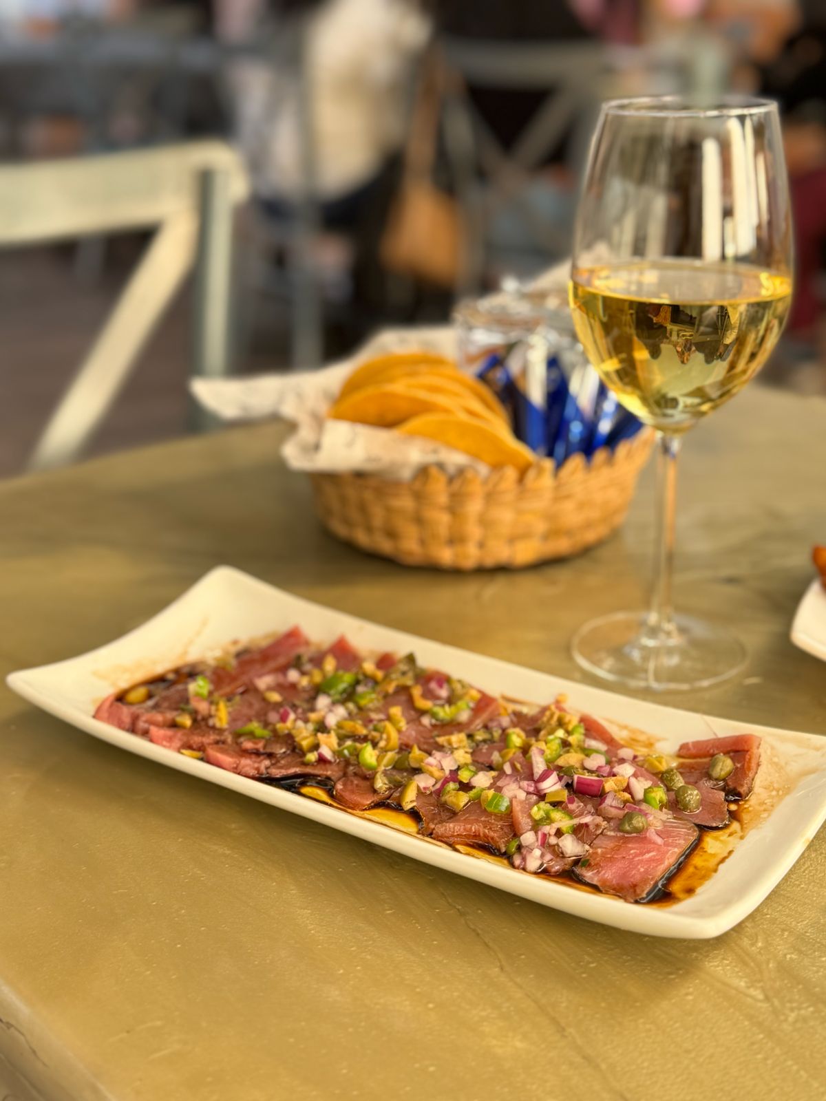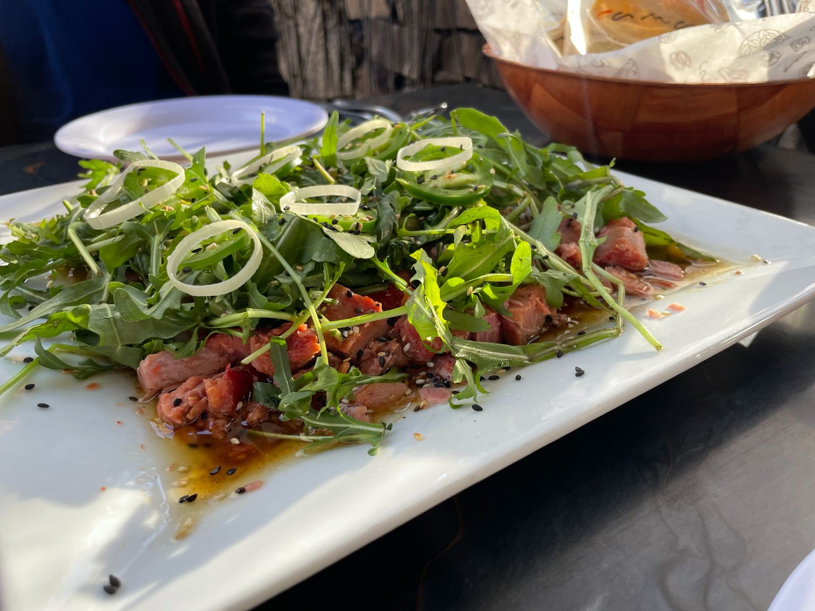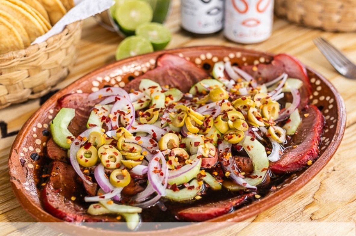 Delicioso Atún finamente fileteado con alcaparra, aceituna, aceite de olivo,balsamico, cebolla y serrano