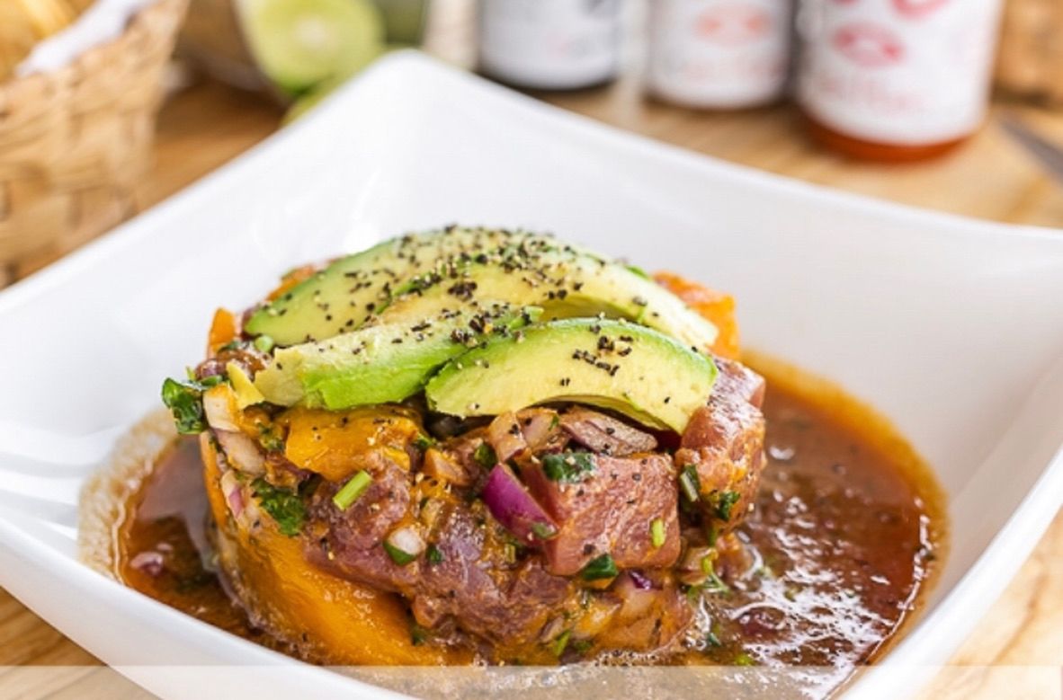 atun en trozos preparado con cebolla morada picada, cilantro, mango y bañado cohn una salsa de soya, jengibre, ajo y limón.