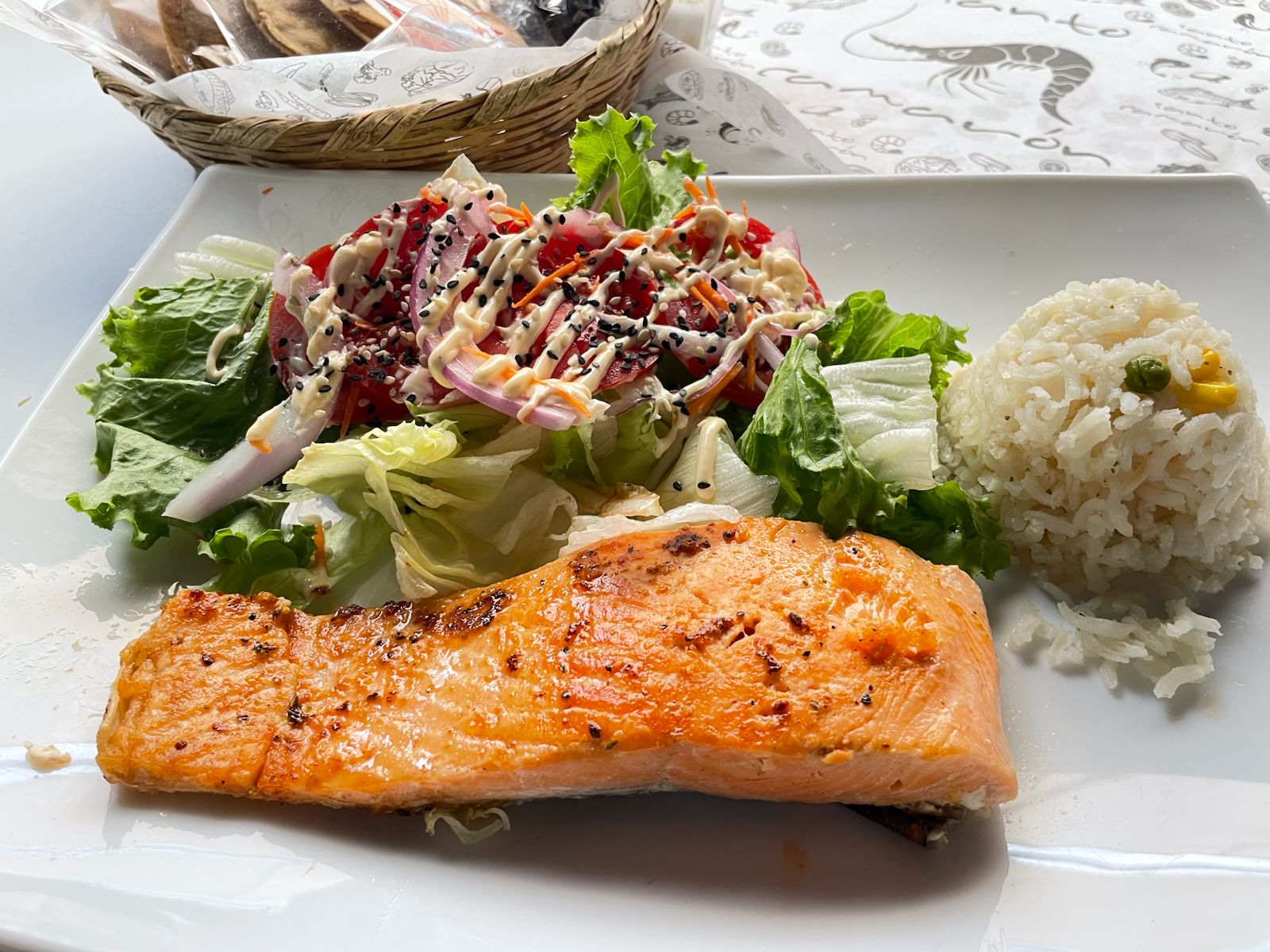 Salmon a la plancha, acompañado de ensalada y arroz blanco