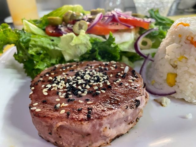 Atun sellado a la parrila acompañado de ensalada y arroz
