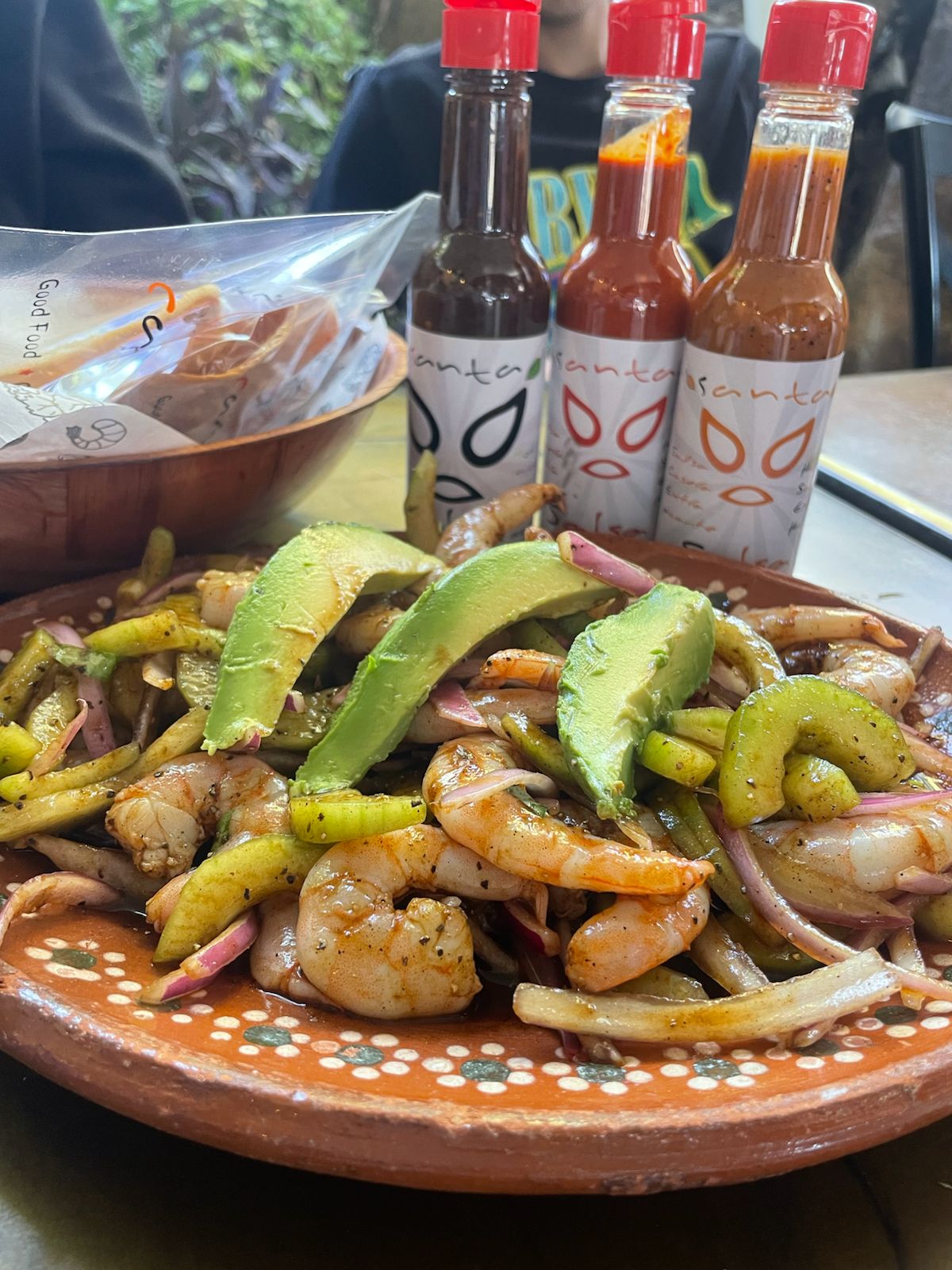 Camaron y marlin preparado con salsa santa negra, naranja, pepino, cebolla, cilantro y jitomate