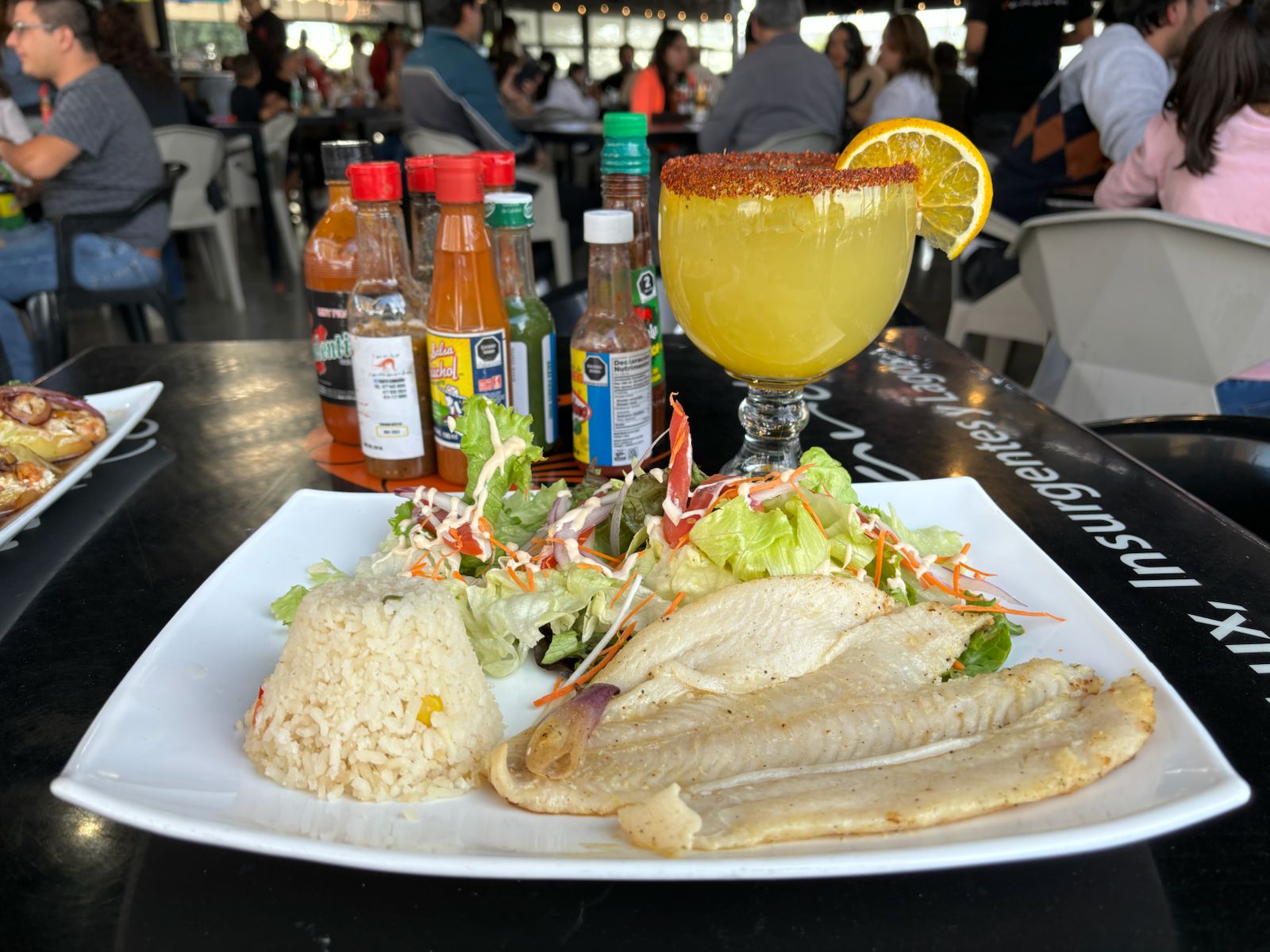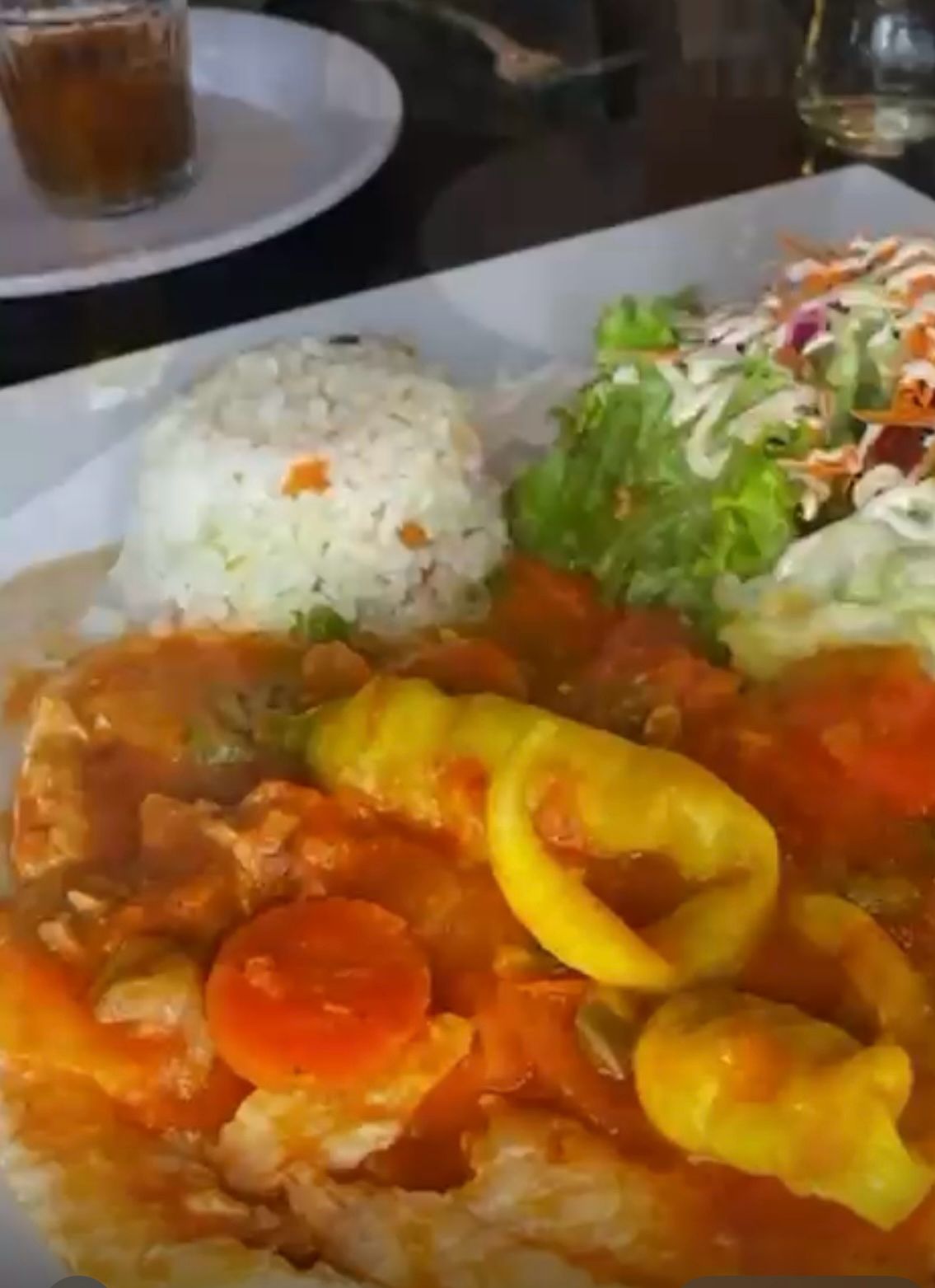 Filete preparado con una crema de mostaza. Acompañado de ensalada y arroz blanco