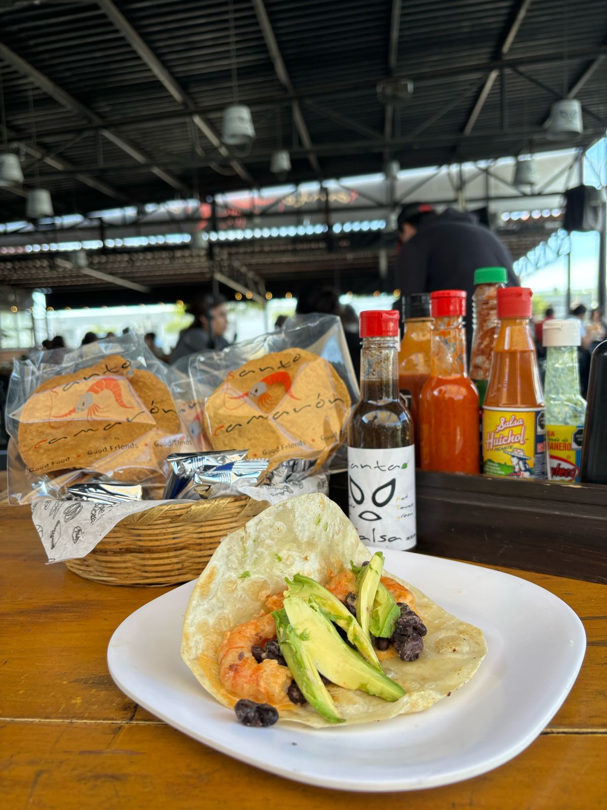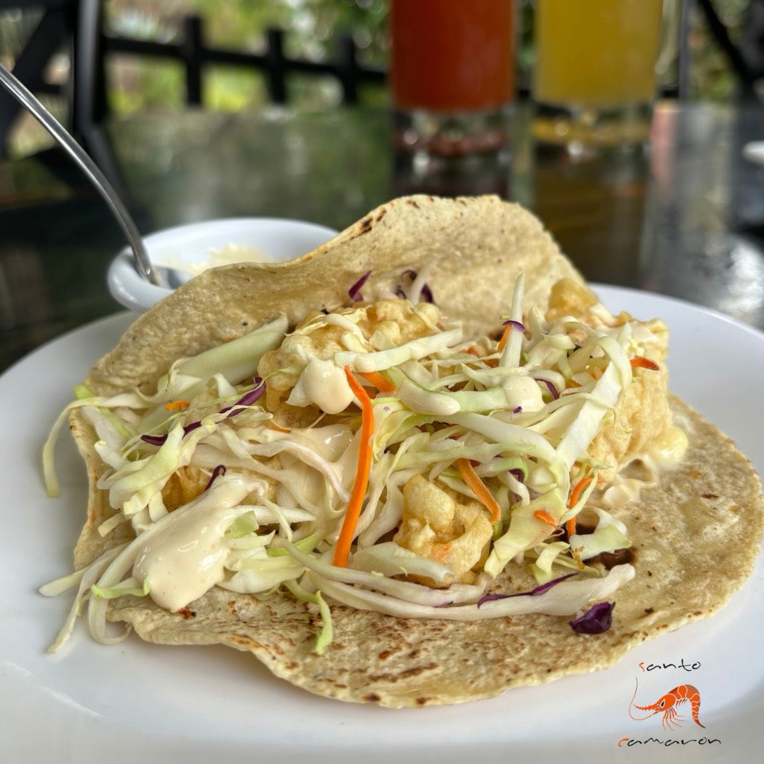 Taco muy al estilo santo hecho con tortilla hecha a mano y camaron capeado, con un poco de mayonesa, y una combinacion de repollo, zanahoria y col morada. Acompañado de un aderezo de chile habanero
