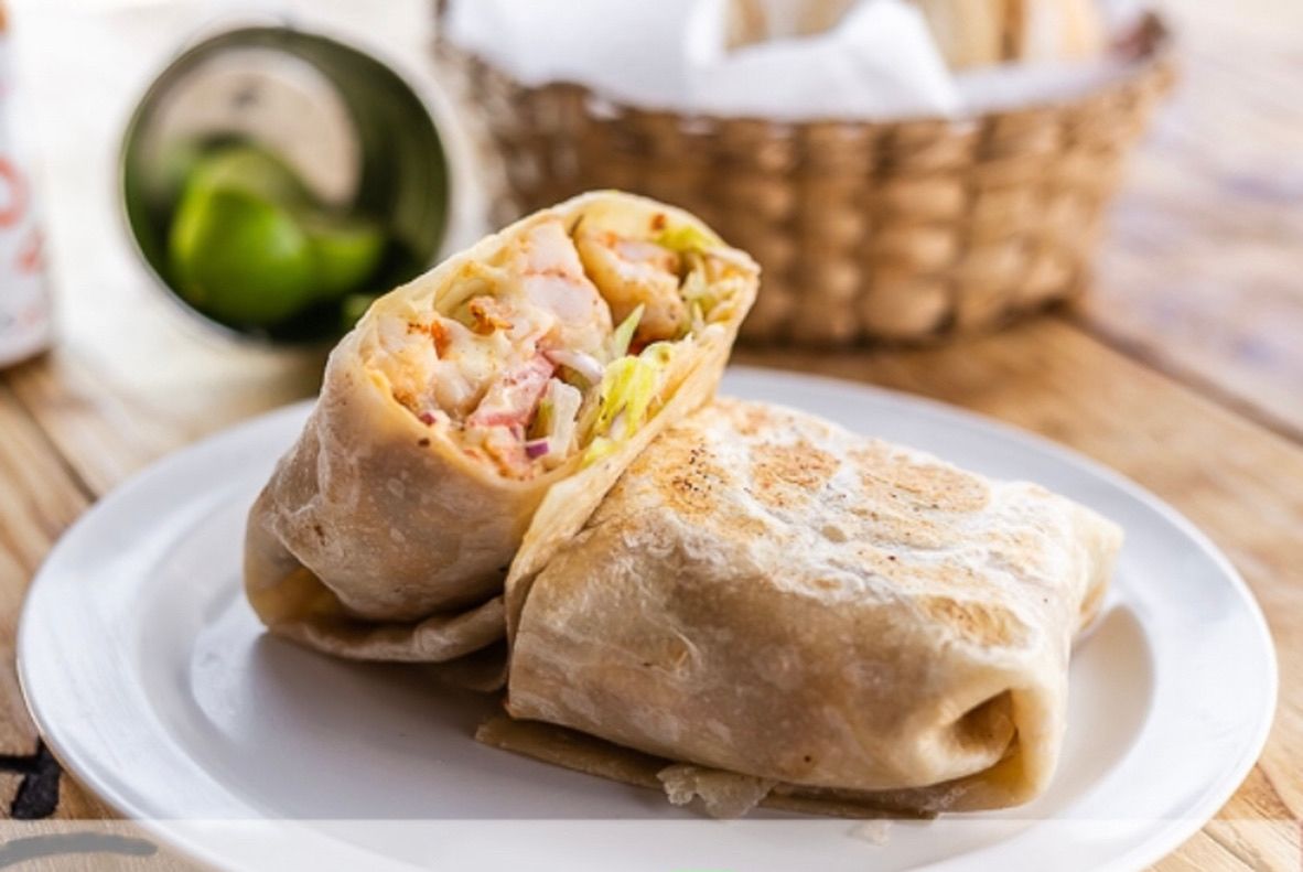 Delicioso tacon de camaron en tortilla de harina gigante, preparado con un aderezo de chile chipotle, queso, cebolla, jitomate y lechuga