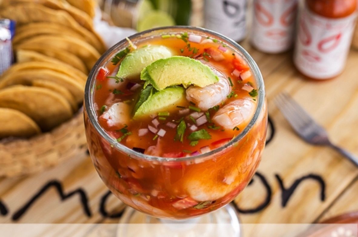 Preparado en frio con salsa bruja, salsa inlgesa, limon, jitomate, cebolla, cilantro, salsa de la casa, salsa catsup y laminas de aguacate