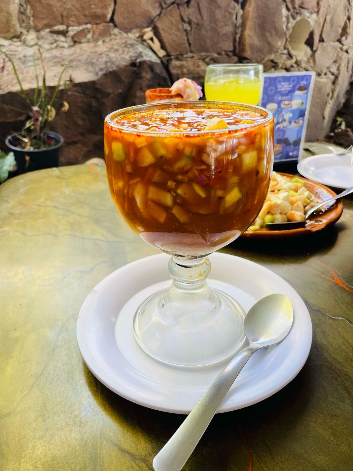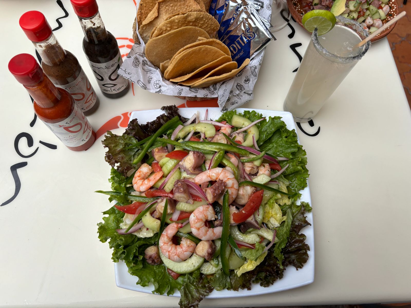 Camarones y pulpos preparados con lechuga romana, pepino, jitomate, cebolla, chile serrano, aceite de olivo, pimienta y salsa inglesa