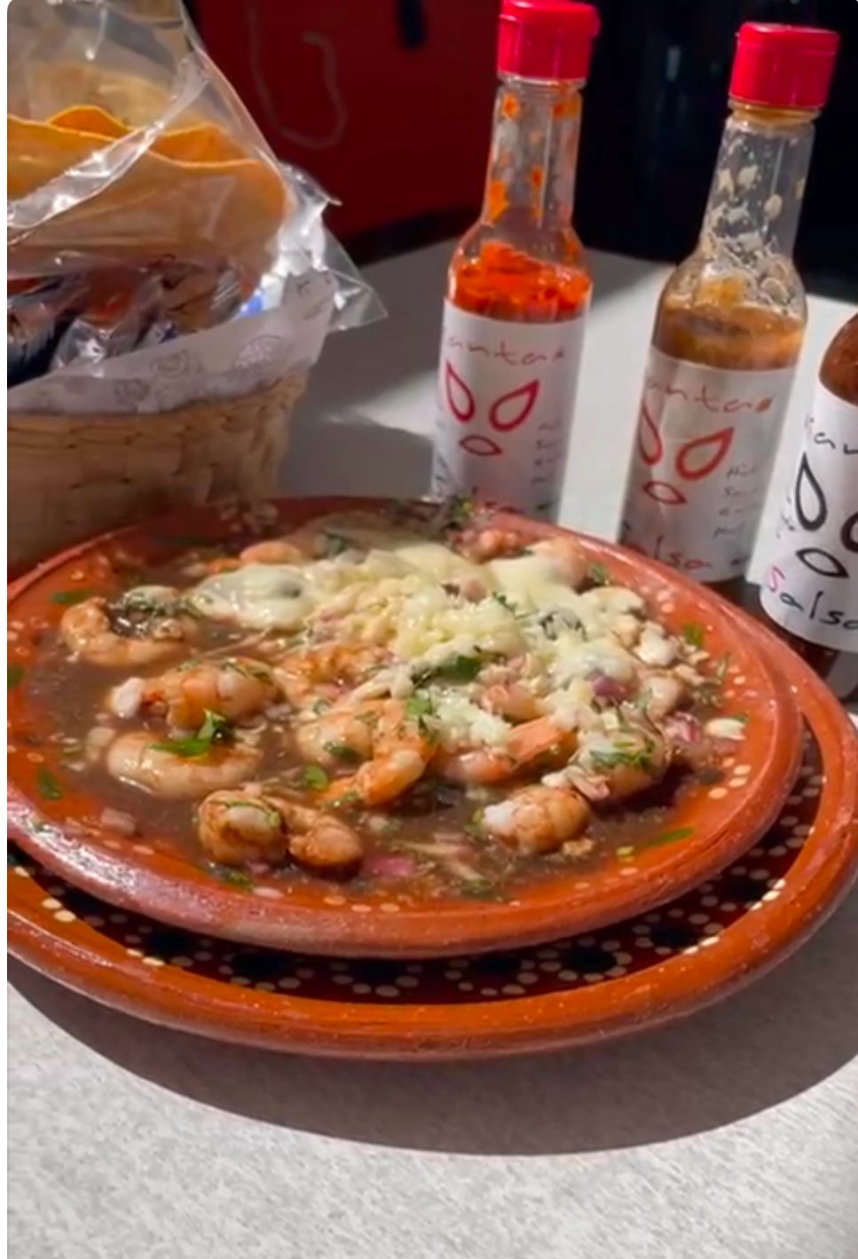 Camarones en crema de chipotle con queso gratinado y tortillas de harina