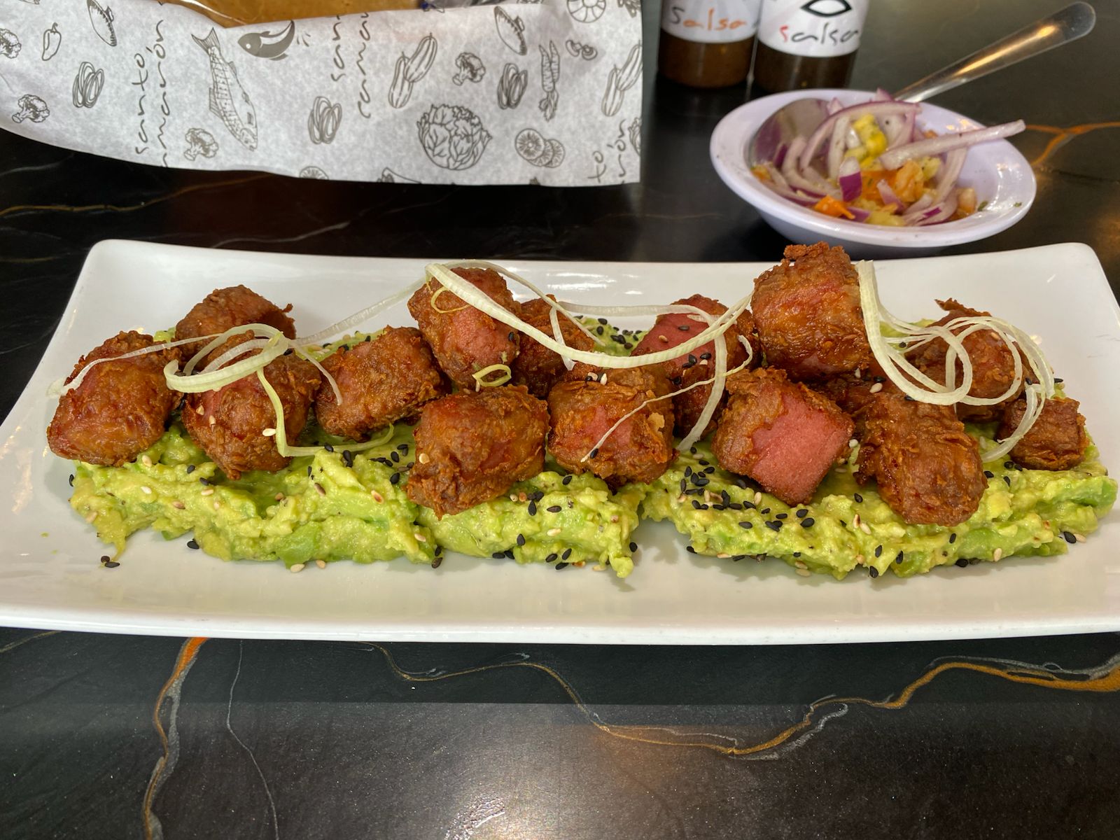 Atun en cubitos capeados y refritos servidos sobre una cama de guacamole y a compañados de tortillas de harina