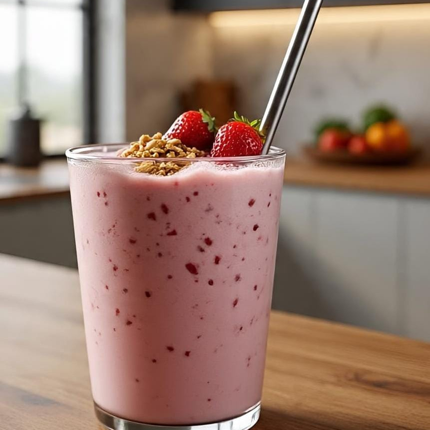 Malteada nutritiva hecha a base de proteína sabor fresa, soya en polvo, agua, hielo, avena y granola, con rodajas de fresa.