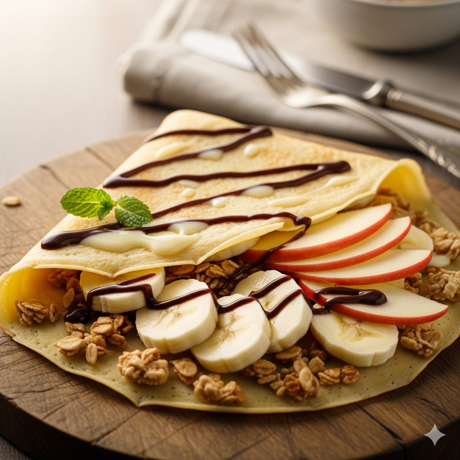 Crepa a base de proteína, avena y canela, acompañado de fruta (plátano, manzana, fresa), granola y arándano.
