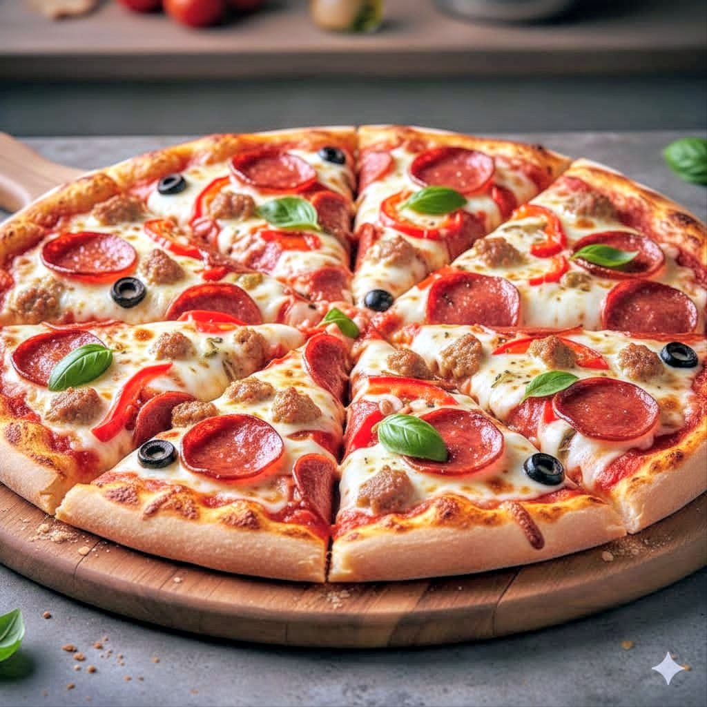 Disfruta de la Pizza Nutritiva en grande (35cm) compuesta de ingredientes naturales (avena triturada, huevo, queso, agua, sal de ajo, proteína y salsa de tomate) perfecta para compartir y sentirte saludable.