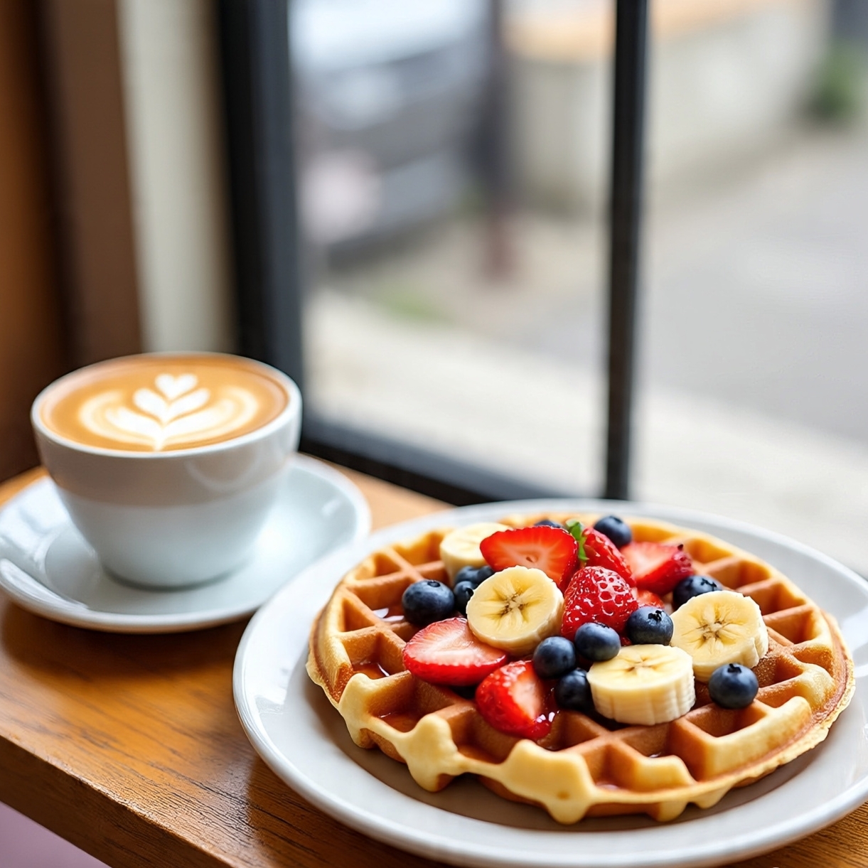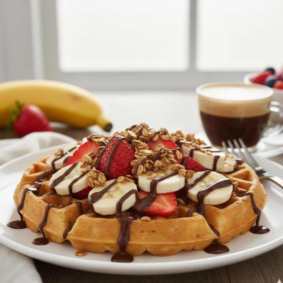 El desayuno nutritivo y delicioso perfecto para tu día: 1 waffle hecho de avena, huevo y proteina en polvo, acompañado de fruta y granola, más un Capuchino bajo en calorías (cafe, proteína y con leche de soya en termo de 1/2 L.)