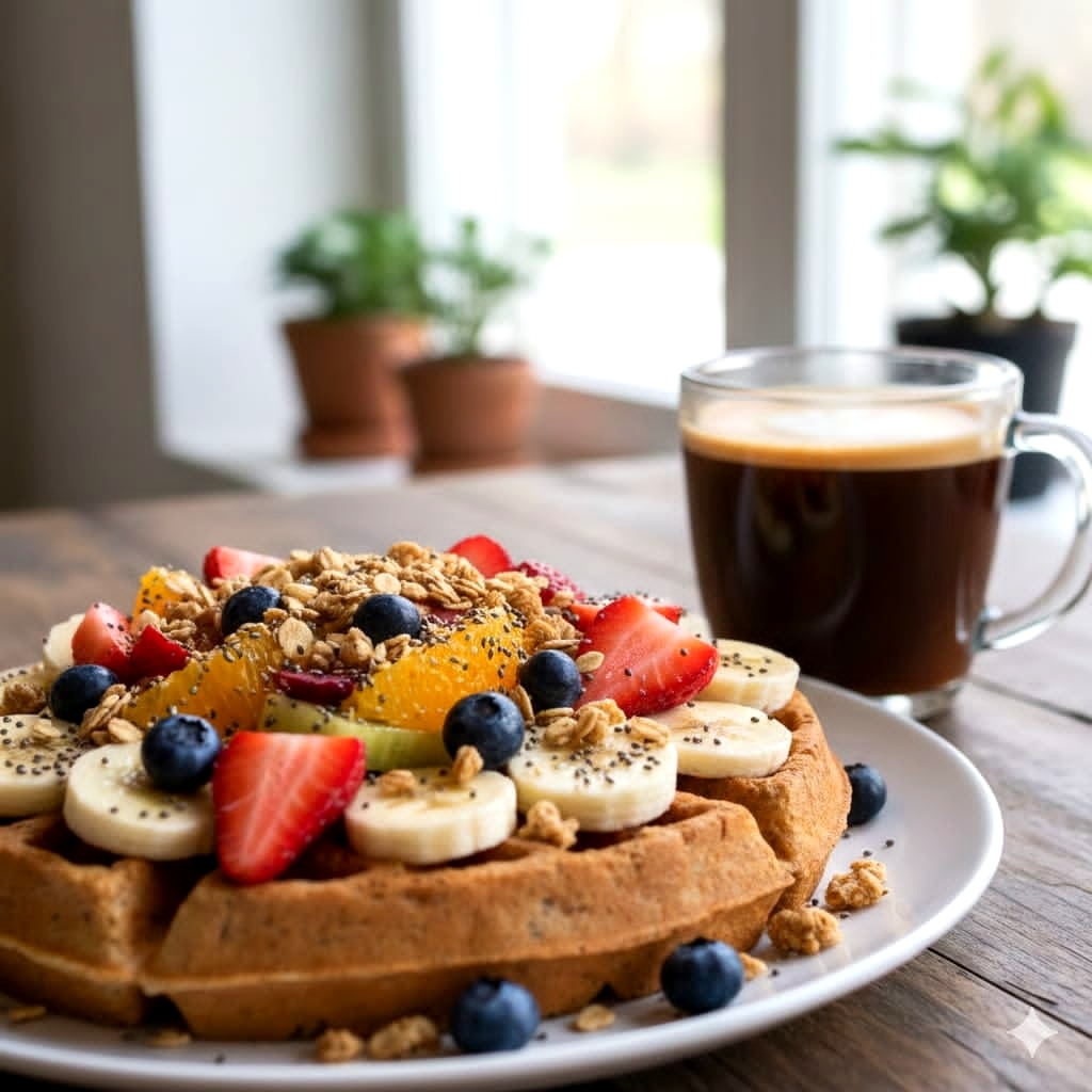 Wafle nutritivo hecho a base de proteína, avena, vainilla y canela, acompañado de fruta (plátano, manzana y fresa), granola y arándano.