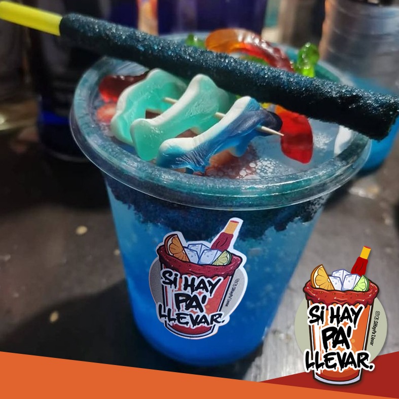 vodka, curacao, refresco de limón y gomitas de tiburón