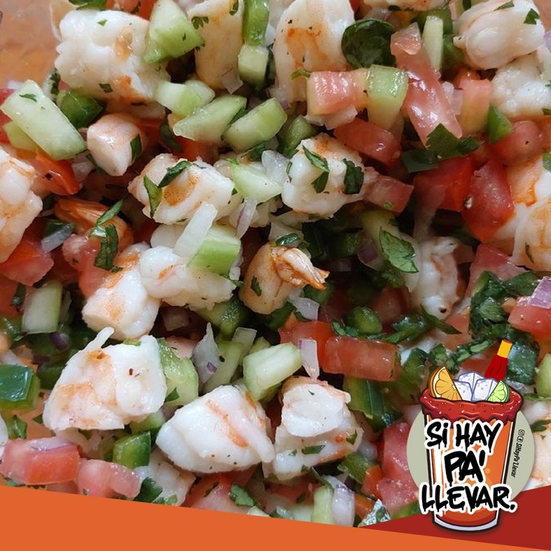 Camarón cocido picado con jitomate, cebolla, pepino, cilantro y una mezcla de salsas agridulces