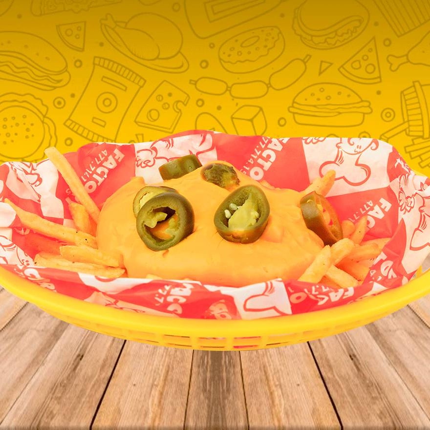Papas fritas crujientes por fuera y suaves por dentro bañadas con queso cheddar fundido y sazonadas a la perfección