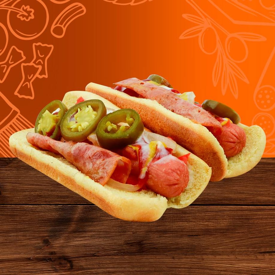 2 piezas de hot dog de salchicha servida en pan suave tipo americano, con mayonesa, mostaza y catsup. Sencillo, delicioso y siempre cumplidor