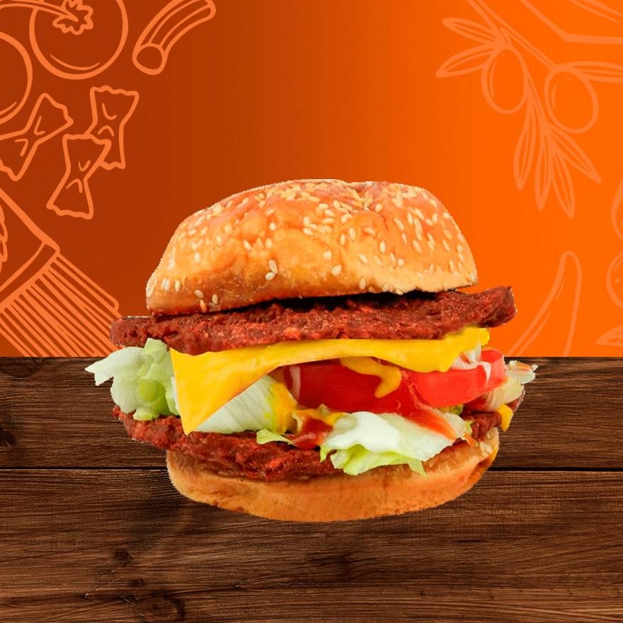 Doble porción de queso y doble carne jugosa, acompañada de vegetales fresco.
