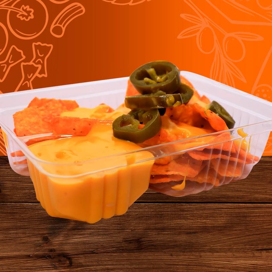 Doritos crujientes bañados con queso cheddar fundido acompañados de jalapeños en rodajas o picado.