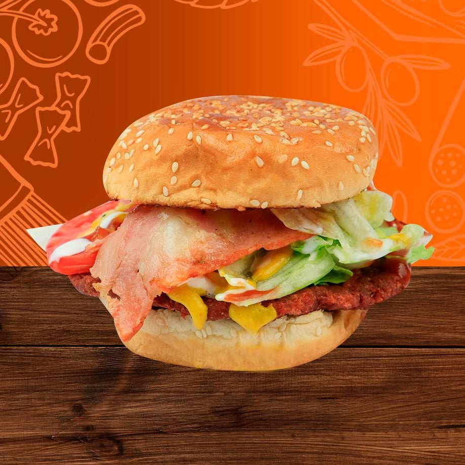 Hamburguesa con tiras crujientes de tocino ahumado y carne jugosa.