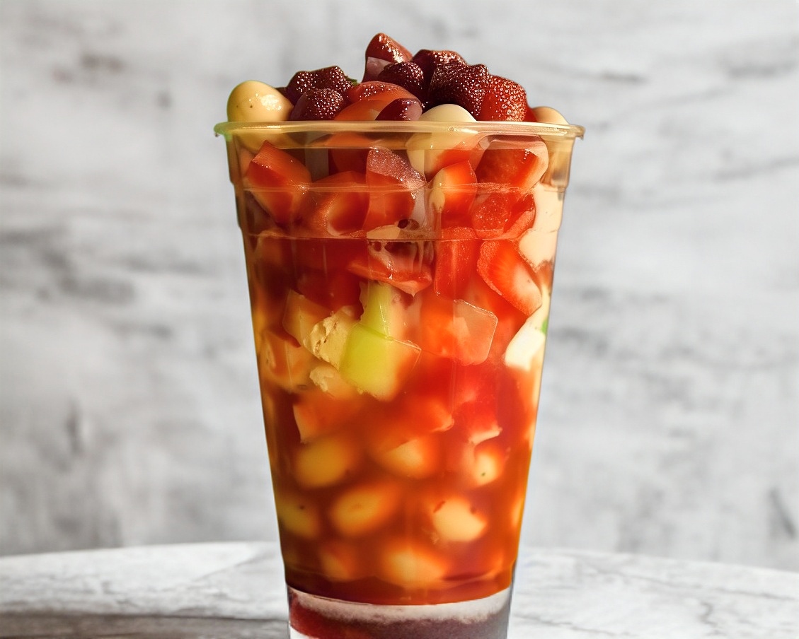 Frappe fresa, chamoy en polvo, tamarindo liquido, gomitas lombrices, banderilla tamarindo.