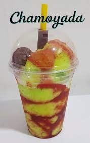 Frappe mango, chamoy en polvo, chamoy liquido, tamarindo liquido, gomitas lombrices y banderilla tamarindo.