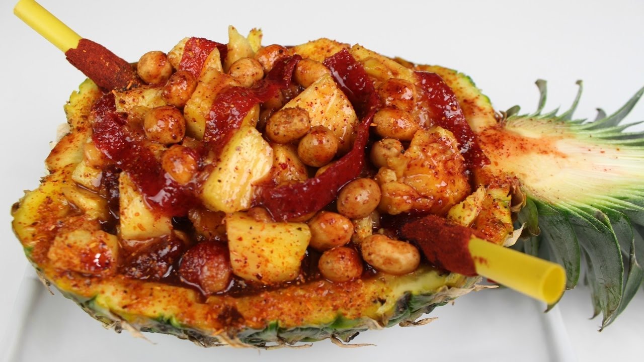 2 Variedad de fruta, 2 variedad de cacahuates, 4 variedad de gomitas, banderilla de tamarindo, limón, chamoy liquido, chamoy en polvo y tamarindo liquido.