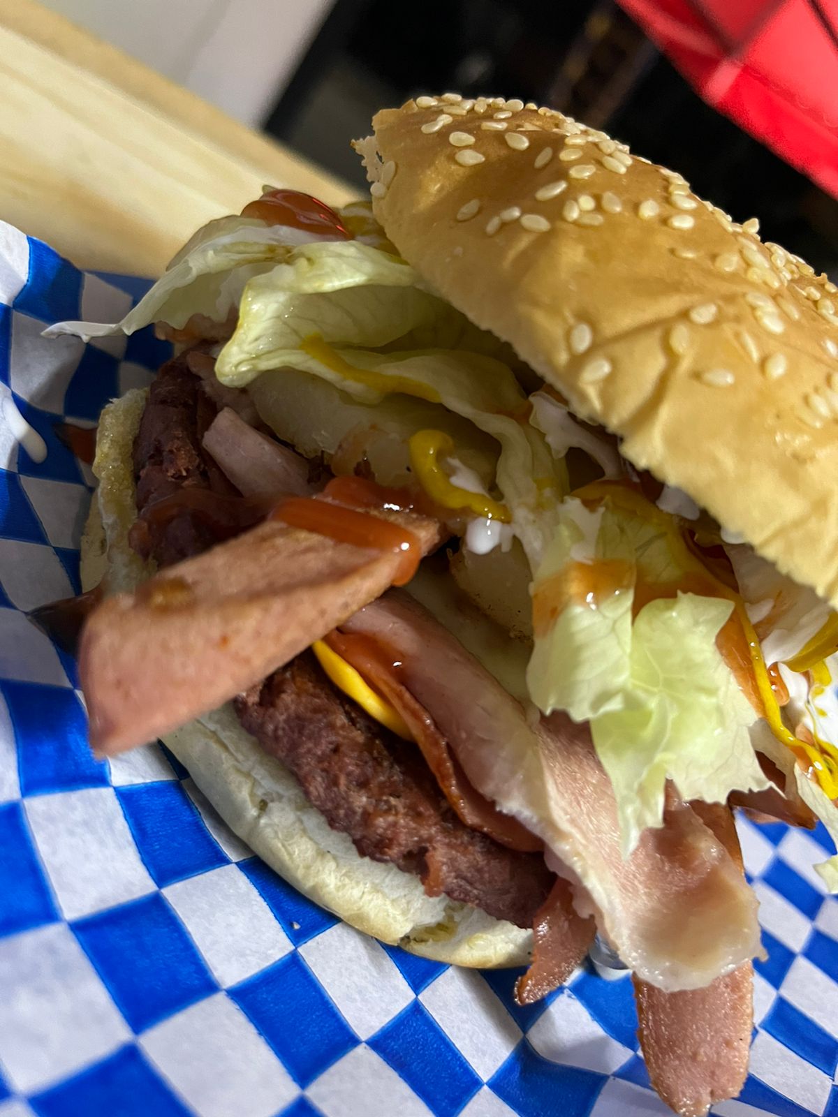 Lechuga, jitomate, cebolla, jalapeño, crema mostaza, catsup, carne, queso amarillo y jamón.
