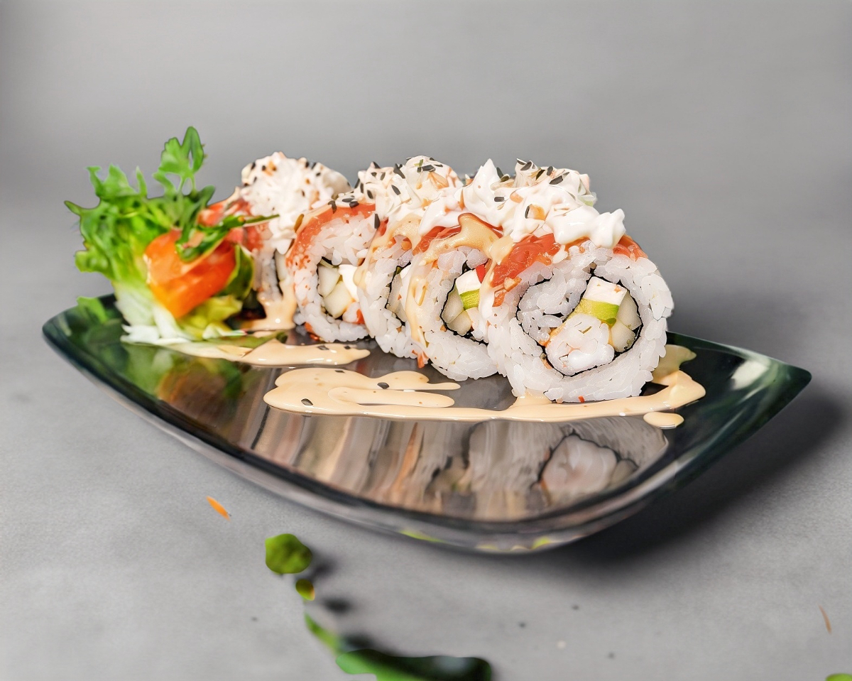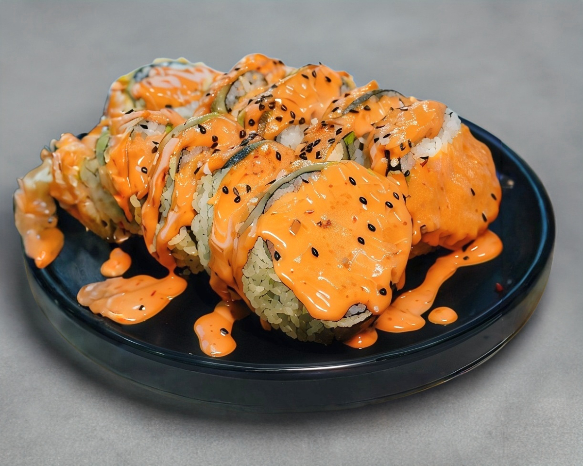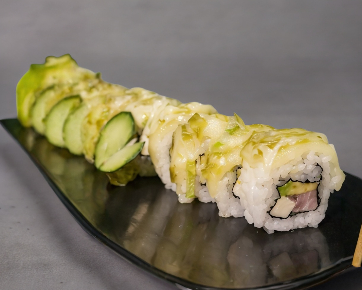 Relleno: pepino aguacate y queso crema, proteína a la elección (camarón, cangrejo, pulpo) cubierto: por alga, arroz, alga capeada y chipotle.