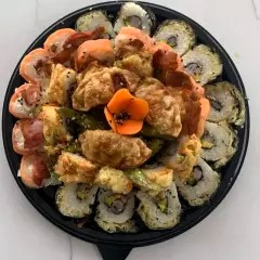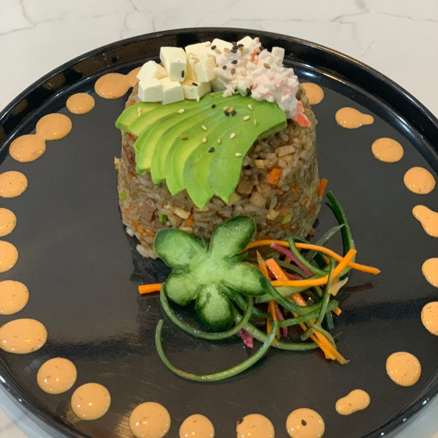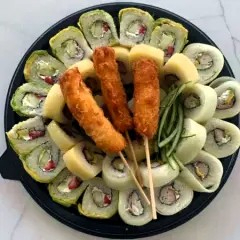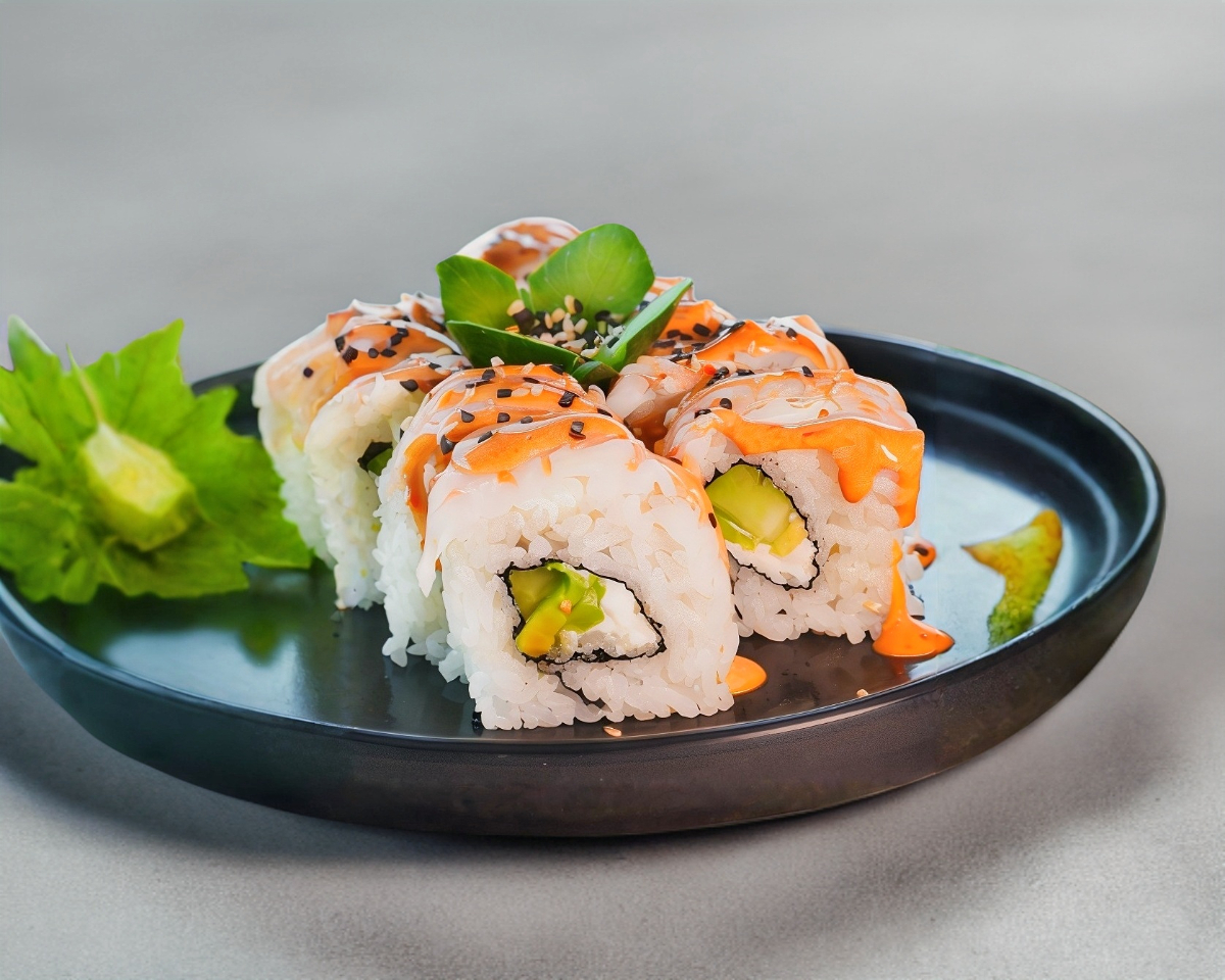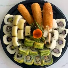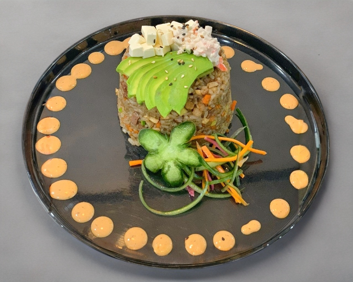 Relleno: pepino aguacate y queso crema, proteína a la elección (camarón, cangrejo, pulpo) cubierto: por alga, arroz, alga capeada y chipotle.