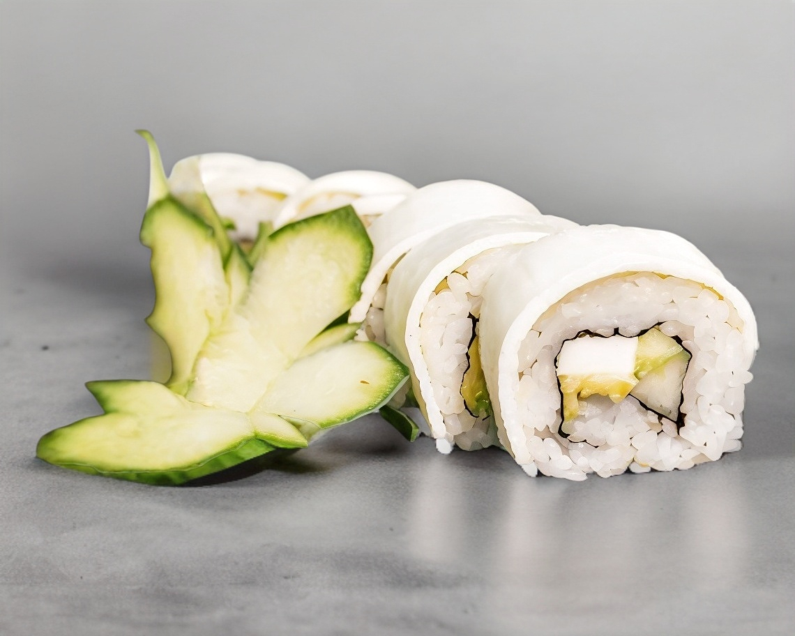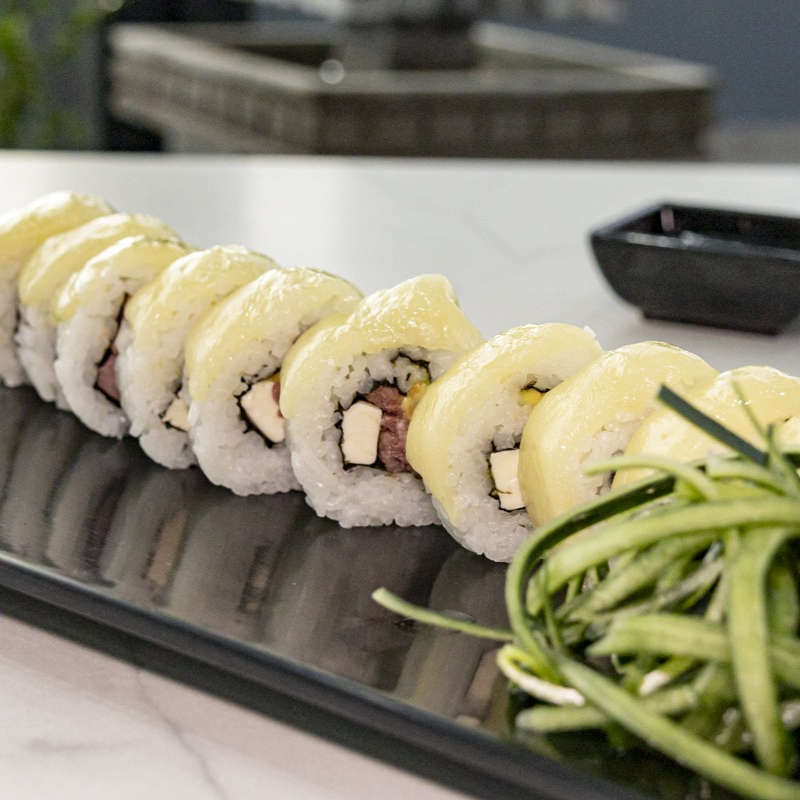 Relleno: pepino aguacate y queso crema, proteína a la elección (camarón, cangrejo, pulpo) cubierto: por alga, arroz y queso crema.